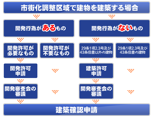 市街化調整区域において開発行為を伴わない建築行為を行う場合には開発許可と同様に制限が課されます。したがって、制限対象外の建築物等を除き、市街化調整区域において建築物等を建築する場合には、開発許可か建築許可のいずれかの許可が必要になります。